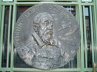 Étienne Dolet was a French scholar, translator and printer. Dolet was a controversial figure throughout his lifetime. His early attacks upon the Inquisition, the city council and other authorities in Toulouse, together with his later publications in Lyon treating of theological subjects, roused the French Inquisition to monitor his activities closely. After being imprisoned several times, he was eventually convicted of heresy, strangled and burned with his books due to the combined efforts of the parlement of Paris, the Inquisition, and the theological faculty of the Sorbonne.