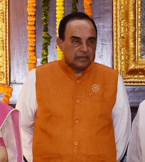 Subramanian Swamy is an Indian politician, economist and statistician, who serves as a nominated Member of Parliament in Rajya Sabha, the upper house of the Indian Parliament. Before joining politics, he was a professor of Mathematical Economics at the Indian Institute of Technology, Delhi. He is known for his Hindu nationalist views. Swamy was a member of the Planning Commission of India and was a Cabinet Minister in the Chandra Shekhar government. Between 1994 and 1996, Swamy was Chairman of the Commission on Labour Standards and International Trade under former Prime Minister P. V. Narasimha Rao. Swamy was a long-time member of the Janata Party, serving as its president until 2013 when he joined the Bharatiya Janata Party (BJP).