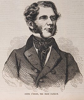 William Smith O'Brien was an Irish nationalist Member of Parliament (MP) and leader of the Young Ireland movement. He also encouraged the use of the Irish language. He was convicted of sedition for his part in the Young Irelander Rebellion of 1848, but his sentence of death was commuted to deportation to Van Diemen's Land. In 1854, he was released on the condition of exile from Ireland, and he lived in Brussels for two years. In 1856 O'Brien was pardoned and returned to Ireland, but he was never active again in politics.