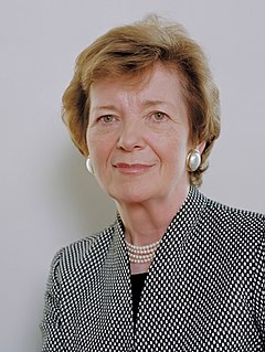 Mary Therese Winifred Robinson is an Irish independent politician who served as the seventh President of Ireland from December 1990 to September 1997, becoming the first woman to hold this office. She also served as United Nations High Commissioner for Human Rights from 1997 to 2002 and a Senator for the University of Dublin from 1969 to 1989. She first rose to prominence as an academic, barrister and campaigner. She defeated Fianna Fáil's Brian Lenihan and Fine Gael's Austin Currie in the 1990 presidential election, becoming the first Independent candidate nominated by the Labour Party, the Workers' Party and Independent Senators. She was the first elected President in the office's history not to have had the support of Fianna Fáil.