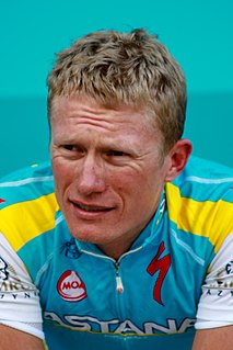 Alexander Nikolayevich Vinokourov is a Kazakh former professional road bicycle racer and current general manager of UCI WorldTeam Astana–Premier Tech. He is of Russian origin. As a competitor, his achievements include two bronze medals at the World Championships, four stage wins in the Tour de France, four in the Vuelta a España plus the overall title in 2006, two Liège–Bastogne–Liège monuments, one Amstel Gold Race, and most recently, the gold medal at the 2012 London Olympics Men's Road Race. Vinokourov is a past national champion of Kazakhstan, and a dual-medalist at the Summer Olympics. In 2007, he received a two-year ban from cycling for blood doping. In 2019, he was accused of race fixing by prosecutors in Liège but was later cleared of the charges.