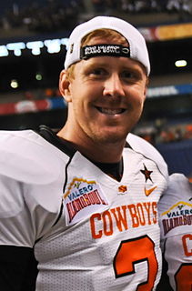 Brandon Kyle Weeden is a former American football quarterback. He played college football for the Oklahoma State Cowboys and was drafted as the 22nd overall pick in the 2012 NFL Draft by the Cleveland Browns. He has also played for the Dallas Cowboys, Tennessee Titans, and Houston Texans.