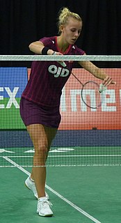 Mia Blichfeldt is a Danish badminton player. She won the gold medals at the 2015 European Junior Championships in the girls' singles event, and later at the 2019 Minsk European Games in the women's singles event.