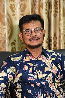 Syahrul Yasin Limpo is an Indonesian politician, who has served as Minister of Agriculture in Joko Widodo's Onward Cabinet since 23 October 2019. He was governor of South Sulawesi from 2008 to 2018.