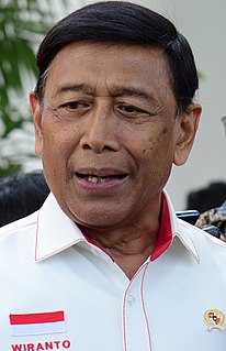 Wiranto is an Indonesian politician and former army general. He was the Commander of the Indonesian National Armed Forces from February 1998 to October 1999 during Indonesia's transition from authoritarian rule to democracy. He ran unsuccessfully for President of Indonesia in 2004 and for the vice-presidency in 2009. On 27 July 2016 Wiranto was appointed Coordinating Minister for Political, Legal, and Security Affairs, replacing Luhut Binsar Panjaitan. Since December 2019, he has served as chairman of the Presidential Advisory Council.
