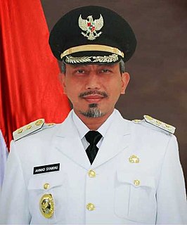 Ahmad Heryawan is an Indonesian politician who served as the Governor of West Java Province between 2008 and 2018. He was inaugurated in April 2008, after winning the West Java gubernatorial election in March 2008. Ahmad Heryawan, together with his running mate Yusuf Macan Effendie, was the governor candidate from PKS and PAN coalition, running the gubernatorial election against Agum Gumelar – Nu'man Abdul Hakim from PDIP and PPP coalition and Danny Setiawan – Iwan Ridwan Sulandjana from Golkar and PD coalition.