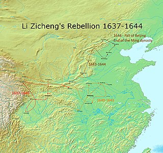 Li Zicheng, born Li Hongji, also known by the nickname, "Dashing King", was a Chinese peasant rebel leader who overthrew the Ming dynasty in 1644 and ruled over northern China briefly as the emperor of the short-lived Shun dynasty before his death a year later.