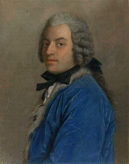 Count Francesco Algarotti was a Venetian polymath, philosopher, poet, essayist, anglophile, art critic and art collector. He was a man of broad knowledge, an expert in Newtonianism, architecture and opera. He was a friend of Frederick the Great and leading authors of his times: Voltaire, Jean-Baptiste de Boyer, Marquis d'Argens, Pierre-Louis de Maupertuis and the atheist Julien Offray de La Mettrie. Lord Chesterfield, Thomas Gray, George Lyttelton, Thomas Hollis, Metastasio, Benedict XIV and Heinrich von Brühl were among his correspondents.
