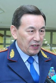 Kalmukhambet Nurmukhanbetuly Kassymov (Kazakh: Қалмұханбет Нұрмұханбетұлы Қасымов, Qalmūhanbet Nūrmūhanbetūly Qasymov; born 18 May 1957) is a Kazakh politician who served as the head of the State Security Service from January 2020 until his dismissal in July 2021, likely due to the scandals revolving the Pegasus Project. Prior to that, Kassymov was the secretary of Security Council of Kazakhstan from February 2019 to January 2020 and the Minister of Internal Affairs from 2011 to 2019.