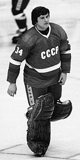 Sergei Aleksandrovich Mylnikov was an ice hockey goaltender and coach who competed in the Soviet Hockey League, National Hockey League, and the Swedish Division 2. He was the first Soviet goaltender to play in the National Hockey League. He mostly played for Traktor Chelyabinsk, and also briefly for SKA Leningrad (1980–82), the Quebec Nordiques (1989–90), Torpedo Yaroslavl (1991–93) and Skedvi/Säter IF (1993–95). He was a member of the Soviet national team, winning a gold medal at the 1988 Winter Olympics and at the 1989 and 1990 IIHF World Championships. He was named to the Soviet All-Star team in 1988 and inducted into the Russian and Soviet Hockey Hall of Fame in 1985. Mylnikov helped the Soviet junior team to back-to-back junior world championships in 1977 and 1978. He was also the starting Soviet goaltender at the Canada Cup in 1987.