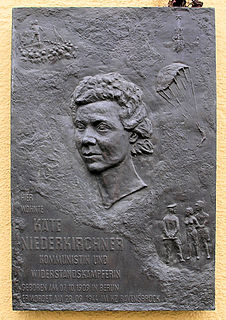 Käthe Niederkirchner was a German Communist resistance activist whose life ended, after she was shot by Nazi paramilitaries, on the night of 27/28 September 1944 at Ravensbrück concentration camp.