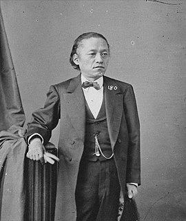 Iwakura Tomomi was a Japanese statesman during the Bakumatsu and Meiji period. He was adopted by the influential Iwakura family, and became perhaps the single most influential leader of the nobility during Japan's transition from feudalism to modernity. By 1858 he was an advisor to the Emperor, but was exiled from the royal court from 1862 to 1867 for his moderation. After release he became the liaison between the court and the anti-Tokugawa movement. He played a central role in the new Meiji government after 1868. He successfully opposed aggressive policies in Korea in the crisis of 1873, and was nearly assassinated by his enemies. He led the 50-member Iwakura Mission for 18 months in Europe and America, studying modern institutions, technology, and diplomacy. The Mission promoted many the key reforms that quickly modernized Japan. He promoted a strong imperial system along Western lines, and played a central role in creating financial institutions for the new nation. A 500 Yen banknote issued by the Bank of Japan carried his portrait.