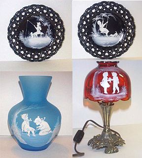 Mary Gregory (1856–1908) was an American artist known for her decoration of glass products at the Boston and Sandwich Glass Company in Cape Cod, Massachusetts. Gregory worked for Boston and Sandwich from 1880 to 1884. Gregory painted lamps and plaques of landscape scenes during her years at B&SGC.