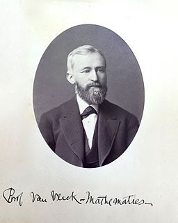 John Monroe Van Vleck was an American mathematician and astronomer. He taught astronomy and mathematics at Wesleyan University in Middletown, Connecticut for more than 50 years (1853-1912), and served as acting university president twice. The Van Vleck Observatory and the crater Van Vleck on the Moon are named after him.