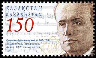 Yevgeny Grigorievich Brusilovsky was a Soviet and Russian composer who settled in Kazakhstan. He wrote the first Kazakh opera, co-wrote the music for the Anthem of the Kazakh Soviet Socialist Republic, and was a People's Artist of the Kazakh SSR.
