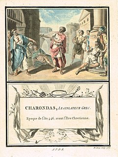 Charondas was a celebrated lawgiver of Catania in Sicily. It is uncertain when he lived; some identify him as a pupil of Pythagoras, but all that can be said is that he lived earlier than Anaxilas of Rhegium, as his laws were in use by the Rhegians until they were abolished by Anaxilas. His laws, originally written in verse, were adopted by the other Chalcidic colonies in Sicily and Italy.