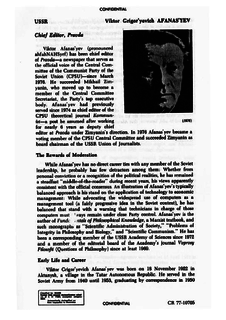 Viktor Grigoryevich Afanasyev was a Soviet public figure, journalist and professor of philosophy who is remembered for his work as a philosophy academic, politician, and news editor. Afanasyev was editor-in-chief (1974-1975) of the journal Kommunist and deputy editor (1968–1974) and editor-in-chief (1976–1989) of Pravda.