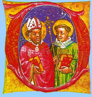 Saint Hermagoras of Aquileia is considered the first bishop of Aquileia, northern Italy. Christian tradition states that he was chosen by Saint Mark to serve as the leader of the nascent Christian community in Aquileia, and that he was consecrated bishop by Saint Peter. Hermagoras and his deacon Fortunatus evangelized the area but were eventually arrested by Sebastius, a representative of Nero. They were tortured and beheaded.