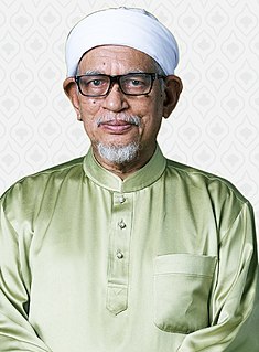 Abdul Hadi bin Awang is a Malaysian politician who has been 7th President of the Malaysian Islamic Party (PAS), an Islamic political party in Malaysia, since July 2002. He was the Menteri Besar of Terengganu from 1999 to 2004, and the state assemblyman for Ru Rendang. He is currently the Member of Parliament (MP) for Marang, both in Terengganu. At the international level, he has been appointed as Vice-President of the International Union of Muslim Scholars.