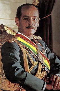 Hugo Banzer Suárez was a Bolivian politician and military officer who served as the 51st President of Bolivia. He held the Bolivian presidency twice: from 1971 to 1978 in a military dictatorship; and then again from 1997 to 2001, as a democratically elected president.