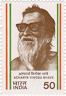 Vinayak Narahari "Vinoba" Bhave was an Indian advocate of nonviolence and human rights. Often called Acharya, he is best known for the Bhoodan Movement. He is considered as a National Teacher of India and the spiritual successor of Mahatma Gandhi. He was an eminent philosopher. The Gita has also been translated into Marathi language by him with the name as Geetai means mother Geeta.