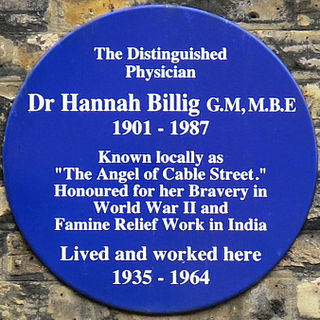 Hannah Billig, was a British doctor who worked in the East End of London. Billig was popular among her patients and her exceptional medical work during the Second World War earned her honours and awards, as well as the nickname "The Angel of Cable Street". After the war, she resumed her medical practice on Cable Street before retiring to Israel, continuing her medical work there until her death.