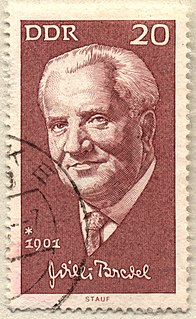 Willi Bredel was a German writer and president of the DDR Academy of Arts, Berlin. Born in Hamburg, he was a pioneer of socialist realist literature.