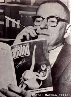John Wood Campbell Jr. was an American science fiction writer and editor. He was editor of Astounding Science Fiction from late 1937 until his death and was part of the Golden Age of Science Fiction. Campbell wrote super-science space opera under his own name and stories under his primary pseudonym, Don A. Stuart. Campbell also used the pen names Karl Van Kampen and Arthur McCann. His novella Who Goes There? was adapted as the films The Thing from Another World (1951), Horror Express (1972), The Thing (1982), and The Thing (2011).