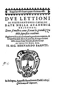 Pietro Antonio Cataldi was an Italian mathematician. A citizen of Bologna, he taught mathematics and astronomy and also worked on military problems. His work included the development of continued fractions and a method for their representation. He was one of many mathematicians who attempted to prove Euclid's fifth postulate.