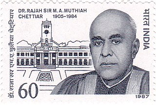 Raja Sir Muttaiya Annamalai Muthiah Chettiar was an Indian banker, politician, philanthropist, socialite and cultural activist who served as Mayor of Madras city (1933) and Minister of Excise and Education (1936–37) in the provincial government of Madras Presidency. He was holder of the hereditary title Kumar-rajah (1929–48) and later, Raja of Chettinad (1948–84).