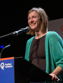 Catherine Dorion is a Canadian politician, who was elected to the National Assembly of Quebec in the 2018 provincial election. She represents the electoral district of Taschereau as a member of Québec solidaire (QS). Dorion is aligned with Option nationale, a pro-independence faction that is a "collective" within QS.