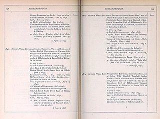Arthur Wills John Wellington Trumbull Blundell Hill, 6th Marquess of Downshire was an Irish peer, styled Earl of Hillsborough until 31 March 1874. He lived chiefly at the family seat, Easthampstead Park, within 5,000 acres in Berkshire. The marquess also owned 115,000 acres in Hillsborough, County Down.