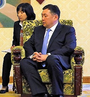 Miyegombyn Enkhbold is a Mongolian politician who was Prime Minister of Mongolia from January 2006 to November 2007 and Deputy Prime Minister from 2007 to 2012. He has been Chairman of the State Great Khural, the Mongolian parliament, since 2016.