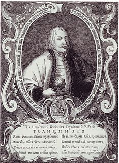 Prince Vasily Vasilyevich Golitsyn was a Russian aristocrat and statesman of the 17th century. He belonged to the Golitsyn as well as Romodanovsky Muscovite noble families and his main political opponent was his cousin Prince Boris Alexeyevich Golitsyn.