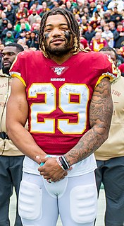 Derrius Guice is an American football running back who is a free agent. He played college football at LSU, where he was the first player in Southeastern Conference (SEC) history with three career games of 250 or more rushing yards, before being drafted by the Washington Redskins in the second round of the 2018 NFL Draft. He appeared in just five games in two years with Washington due to multiple knee injuries and was released after being charged for crimes related to domestic violence in 2020.