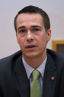 Carl Christoffer ”Calle” Haglund is a managing director at Accenture and a former Finnish politician, former chairman of the Swedish People's Party and the former Minister of Defence. He was member of the European Parliament (MEP) from 2009 to 2012. Haglund was elected chairman of his party in June 2012.