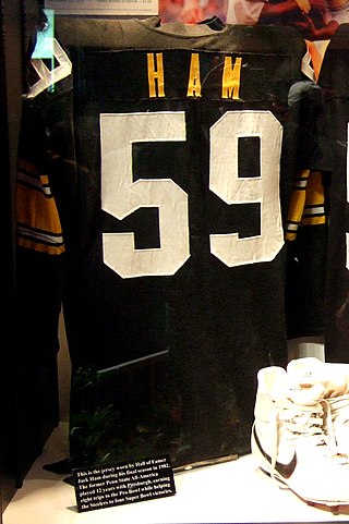 Jack Raphael Ham Jr. is an American former professional football player who was an outside linebacker for the Pittsburgh Steelers of the National Football League (NFL) from 1971 to 1982. He is considered one of the greatest outside linebackers in the history of the NFL. Ham was inducted into the Pro Football Hall of Fame in 1988 and the College Football Hall of Fame in 1990. In mid-2019 the newsletter of the PSU Alumni Association rated Ham first among the 100 greatest athletes, considering all sports and all previous football players, in University history.