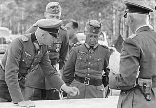 Hermann Hoth was a German army commander and war criminal during World War II. He fought in the Battle of France and as a panzer commander on the Eastern Front. Hoth commanded the 3rd Panzer Group during Operation Barbarossa in 1941, and the 4th Panzer Army during the Wehrmacht's 1942 summer offensive.