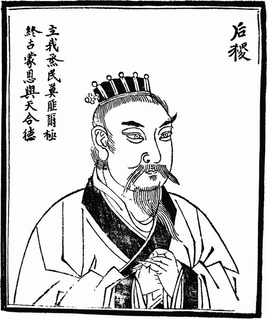 Hou Ji was a legendary Chinese culture hero credited with introducing millet to humanity during the time of the Xia dynasty. Millet was the original staple grain of northern China, prior to the introduction of wheat. His name translates as Lord of Millet and was a posthumous name bestowed on him by King Tang, the first of the Shang dynasty. Houji was credited with developing the philosophy of Agriculturalism and with service during the Great Flood in the reign of Yao; he was also claimed as an ancestor of the Ji clan that became the ruling family of the Zhou dynasty.