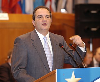Konstantinos A. Karamanlis, commonly known as Kostas Karamanlis, is a Greek politician who served as Prime Minister of Greece from 2004 to 2009. He was also president of the centre-right New Democracy party, founded by his uncle Konstantinos Karamanlis, from 1997 to 2009, and he is currently a member of the Hellenic Parliament.