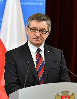 Marek Tadeusz Kuchciński is a member of the Sejm of Poland, first elected in 2001. Before 2015, he served the parliament as one of the Deputy Marshals of the Sejm, nominated by the Law and Justice club, and also as the Parliamentary Caucus Head of the above-mentioned party. From 2015 to 2019, when his party possessed the majority of seats in both houses, he held the office of Marshal of the Sejm.