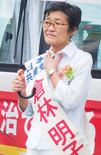 Akiko Kurabayashi is a member of the Japanese House of Councillors and member of the Japanese Communist Party. She was a former nurse. She has previously served on the Kyoto Prefectural Assembly, to which she was elected in 1994, and on the Kyoto City Assembly, to which she served five terms, starting with her election to the assembly in 1995. Kurabayashi was elected to her position in the National Diet in 2013.