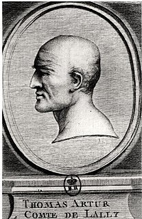Thomas Arthur, comte de Lally, baron de Tollendal was a French general of Irish Jacobite ancestry. Lally commanded French forces, including two battalions of his own red-coated Regiment of Lally of the Irish Brigade, in India during the Seven Years' War. After a failed attempt to capture Madras he lost the Battle of Wandiwash to British forces under Eyre Coote and then was forced to surrender the remaining French post at Pondicherry. After a time spent as a prisoner of war in Britain, Lally voluntarily returned to France to face charges where he was beheaded for his alleged failures in India. Ultimately the jealousies and disloyalties of other officers, together with insufficient resources and limited naval support prevented Lally from securing India for France. In 1778, he was publicly exonerated by Louis XVI from his alleged crime.