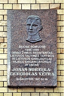 Jonas Noreika, also known by his post-war nom de guerre Generolas Vėtra, was a Lithuanian anti-Soviet partisan, military officer, Nazi collaborator and a prisoner at the Nazi Stutthof concentration camp (1942-45).