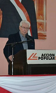 Javier Alva Orlandini was a peruvian lawyer and politician. A prominent member of the political party Popular Action, he served as the President of the party. He served as the Second Vice President of Peru during the government of Fernando Belaúnde from 1980 to 1985. Throughout his life he became a Deputy (1963–1968), Minister of Government and Police (1965–1966), Senator, President of the Senate (1981–1982), and Congressman (1995–2000). In 2002, he became a Magistrate of the Constitutional Court, at the same time being elected by Congress as the President of the Court for a 3-year term. He was a candidate for the Presidency of the Republic in 1985, but he only got 7.3% of the popular vote, placing fourth and lost the election to Alan García. He later served as President of Peru's Constitutional Tribunal from 2002 to 2005.
