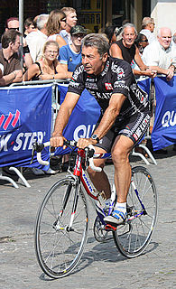 Eddy Planckaert is a former professional road racing cyclist from Belgium. In 1988, Planckaert enjoyed perhaps his best year by capturing the green jersey at the 1988 Tour de France and winning the Tour of Flanders. In 1990, he won Paris–Roubaix, his second monumental classic, with the closest finish in the race's history beating Canadian Steve Bauer by less than a cm. A strong sprinter, Planckaert is one of the riders with stage wins at all three cycling Grand Tours.