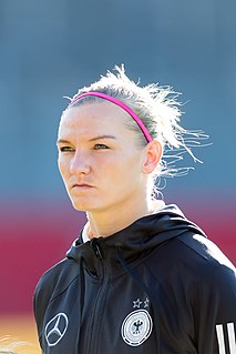 Alexandra Popp is a German footballer and Olympic gold medalist. She plays as a striker for VfL Wolfsburg and the Germany national team. She previously played for FCR 2001 Duisburg and 1. FFC Recklinghausen. Popp was named German Footballer of the Year twice, in 2014 and 2016, and in February 2019, was named captain of the national team.