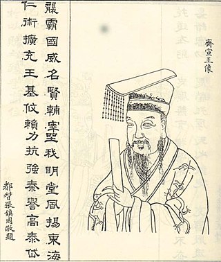 King Xuan of Qi was from 319 to 301 BC ruler of Qi, one of the seven major states of the Warring States period of ancient China. King Xuan's personal name was Tian Bijiang (田辟疆), ancestral name Gui (媯), and King Xuan was his posthumous title.