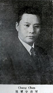Zhang Qun or Chang Ch'ün also known as Zhang Yuejun (張岳軍), was premier of the Republic of China and a prominent member of the Kuomintang. He served as secretary general to the President of the Republic from 1954 to 1972 and senior advisor to Presidents Chiang Kai-shek, Yen Chia-kan, Chiang Ching-kuo, and Lee Teng-hui. Under the influence of his wife, Ma Yu-ying, he became a Christian in the 1930s.