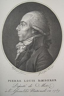 Comte Pierre Louis Roederer was a French politician, economist, and historian, politically active in the era of the French Revolution and First French Republic. Roederer's son, Baron Antoine Marie Roederer (1782–1865), also became a noted political figure.